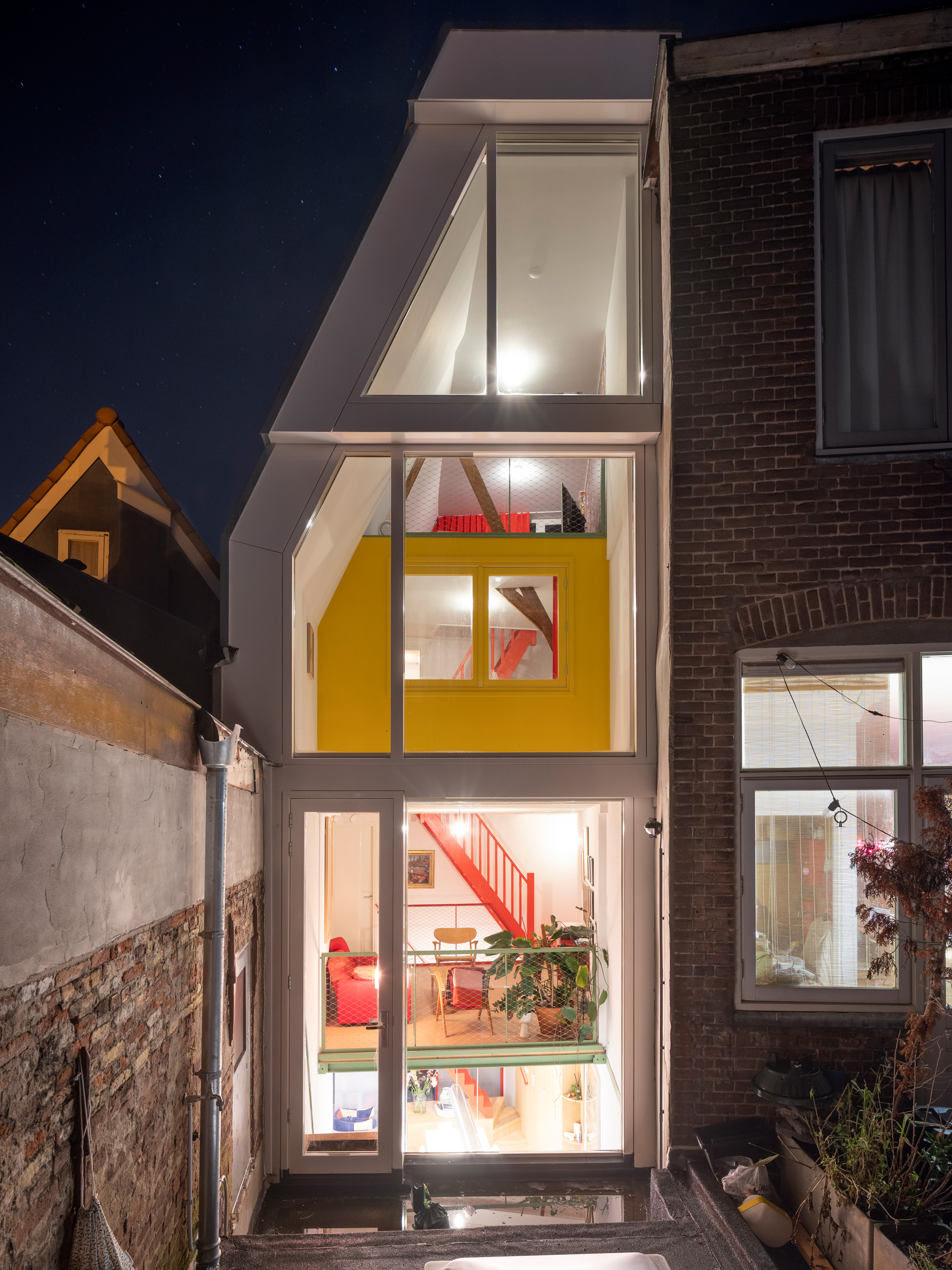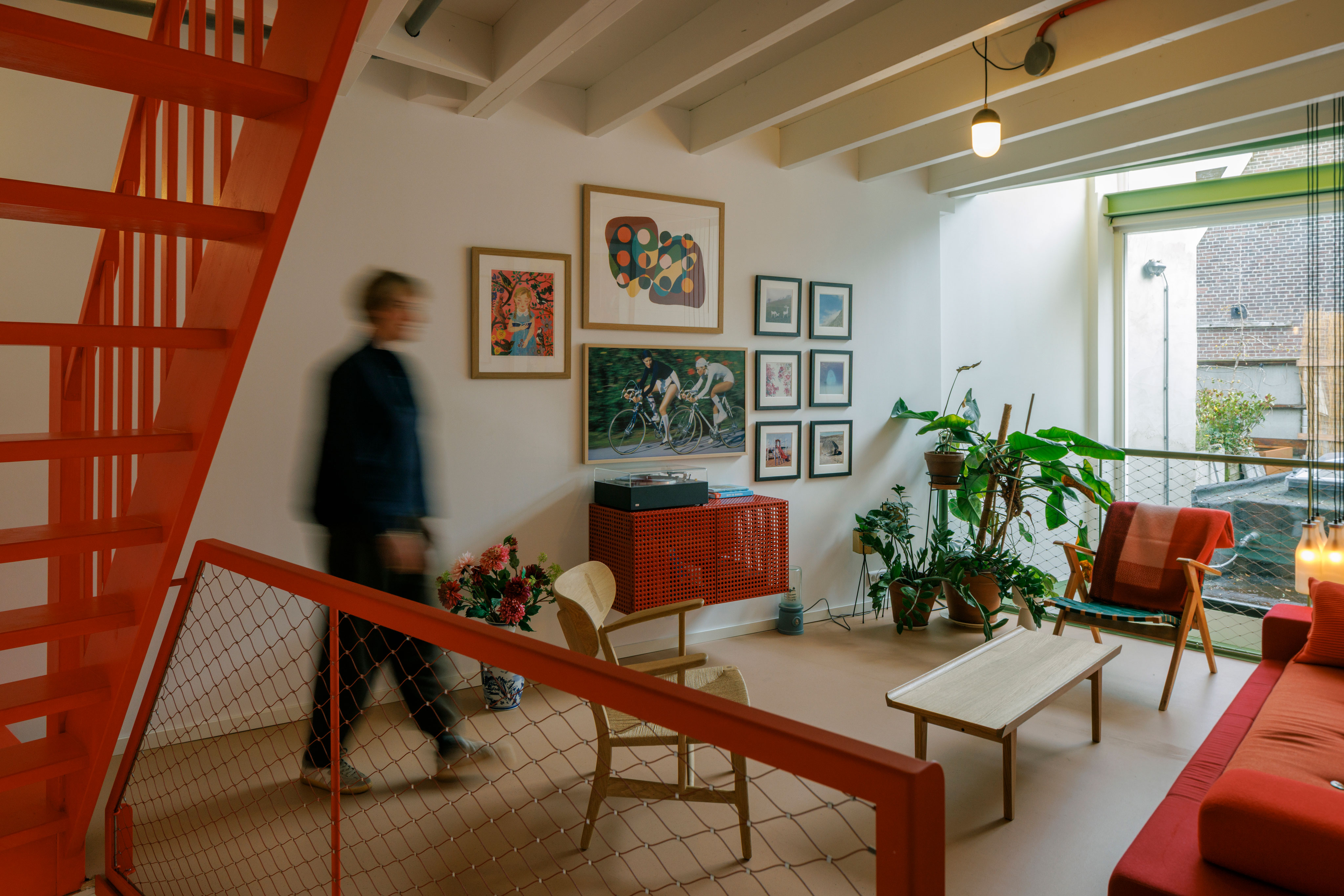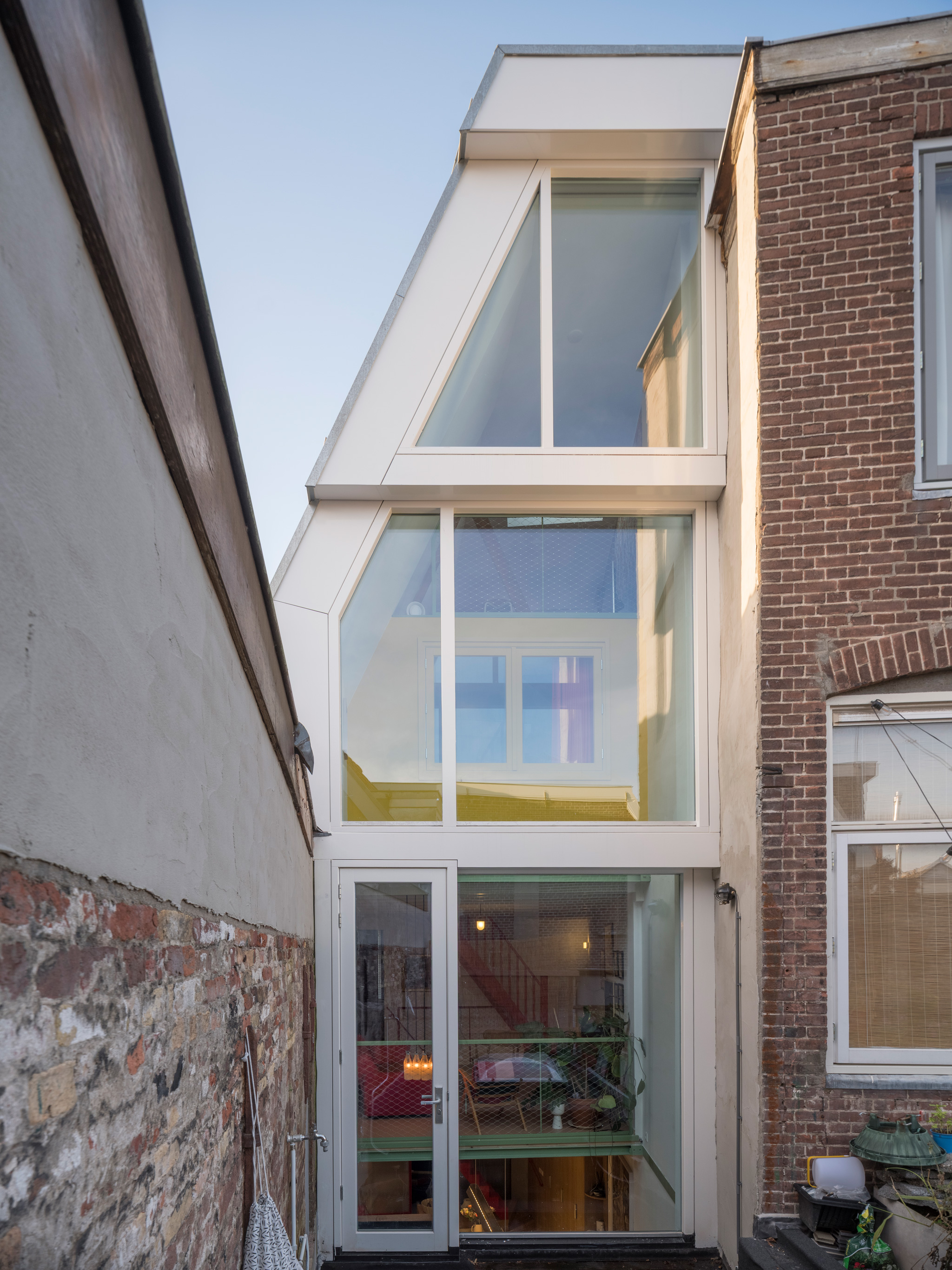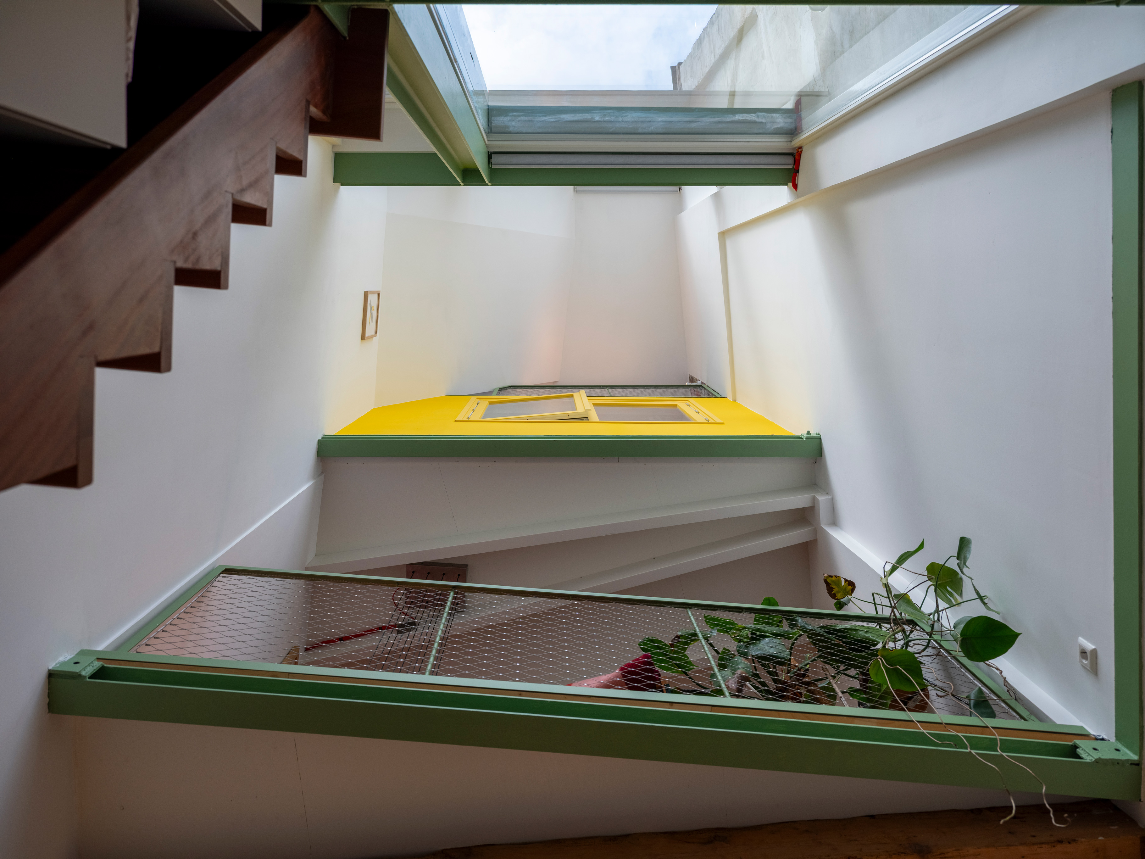 The floor plan is characterized by its wedge-shape where the back part is only two meters wide. Squeezed between the neighboring buildings also meant a lack of daylight and proper connection to the outside court. Opening up the building’s floors and facade where it is the most narrow is the main intervention to bring in the highly needed daylight into the living spaces. This light well also creates new relationships between the various functions: physical and visual. Where previously the house was cramped and claustrophobic, it has now become the surprising and spacious 'internal street' that uses the full eleven meters height of the building.