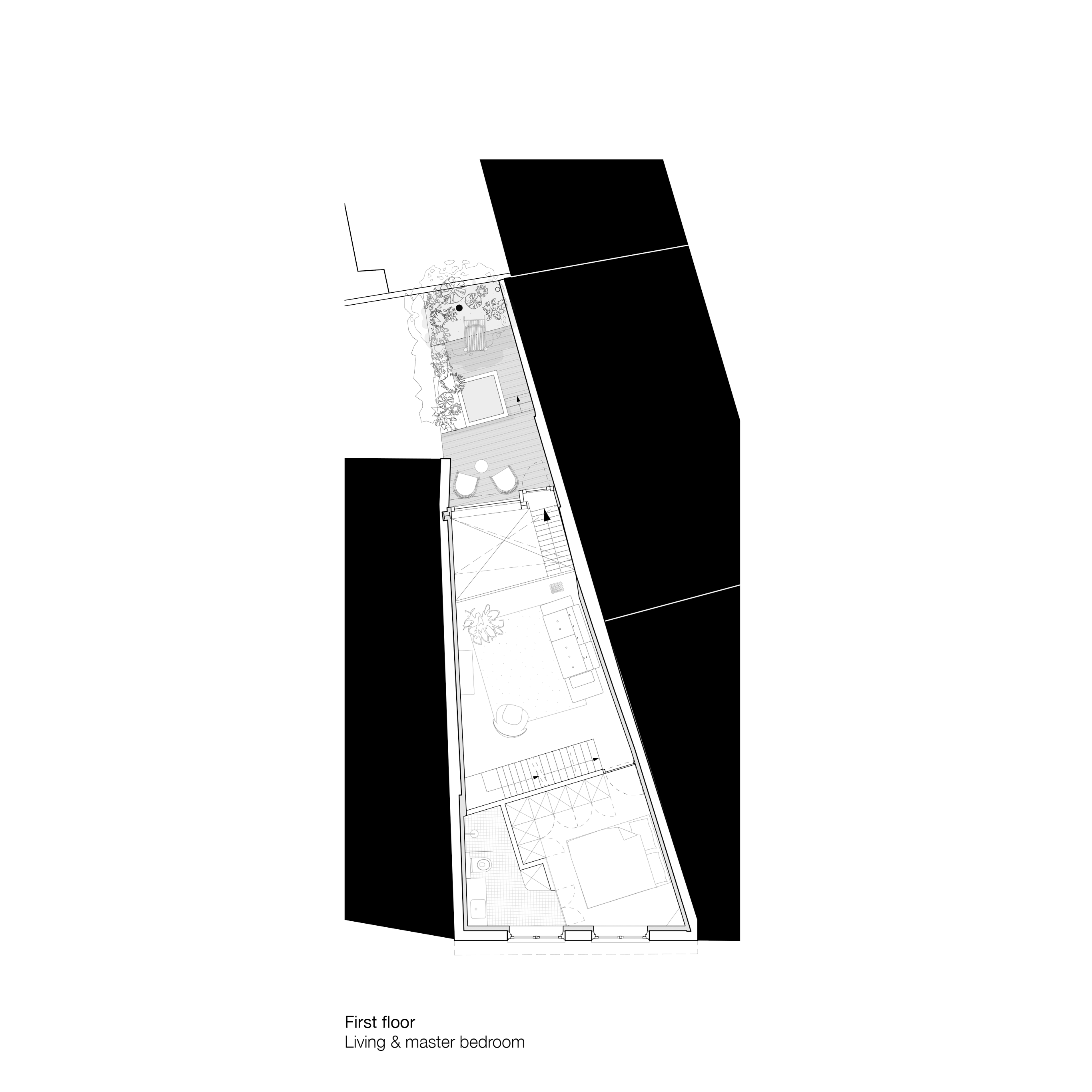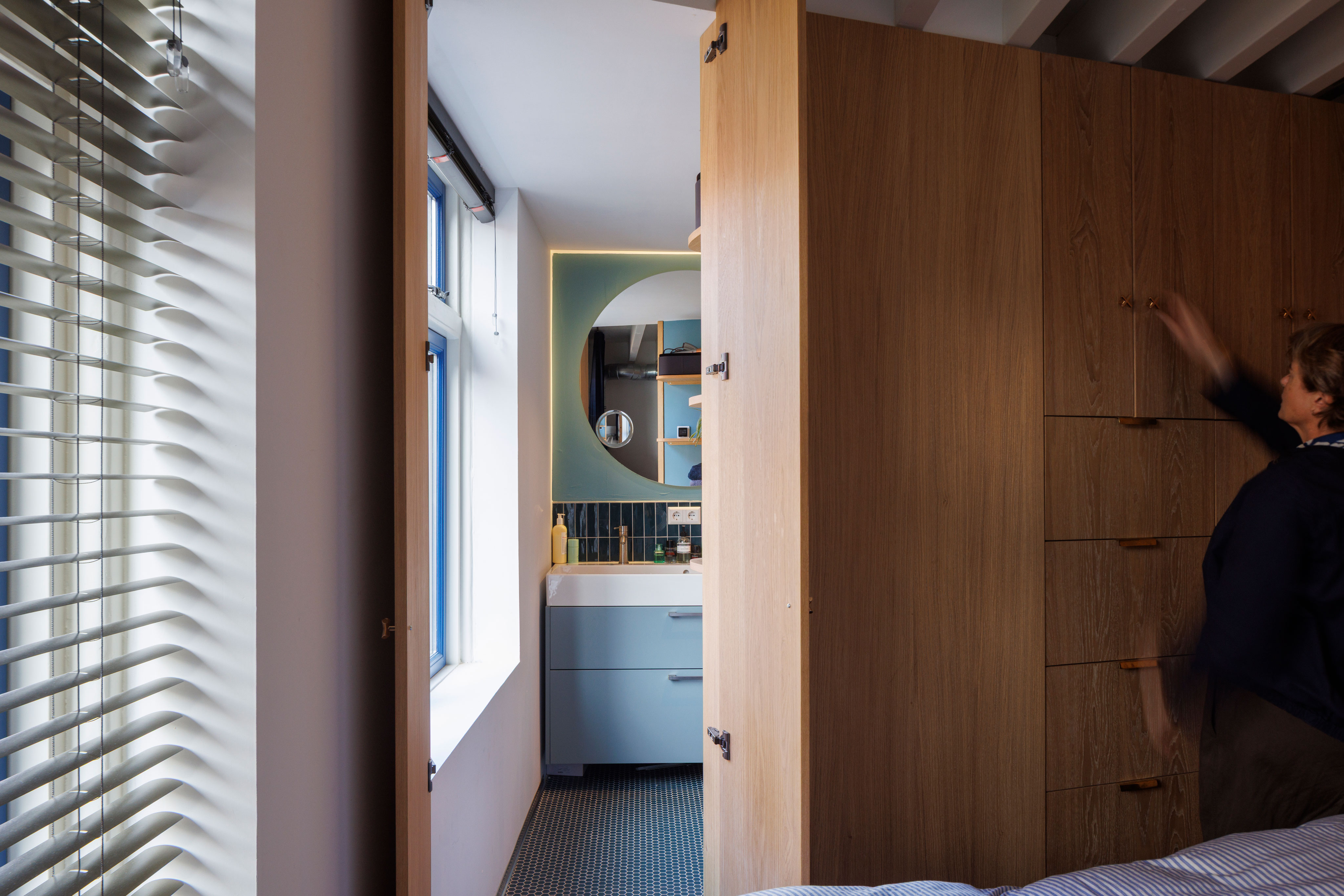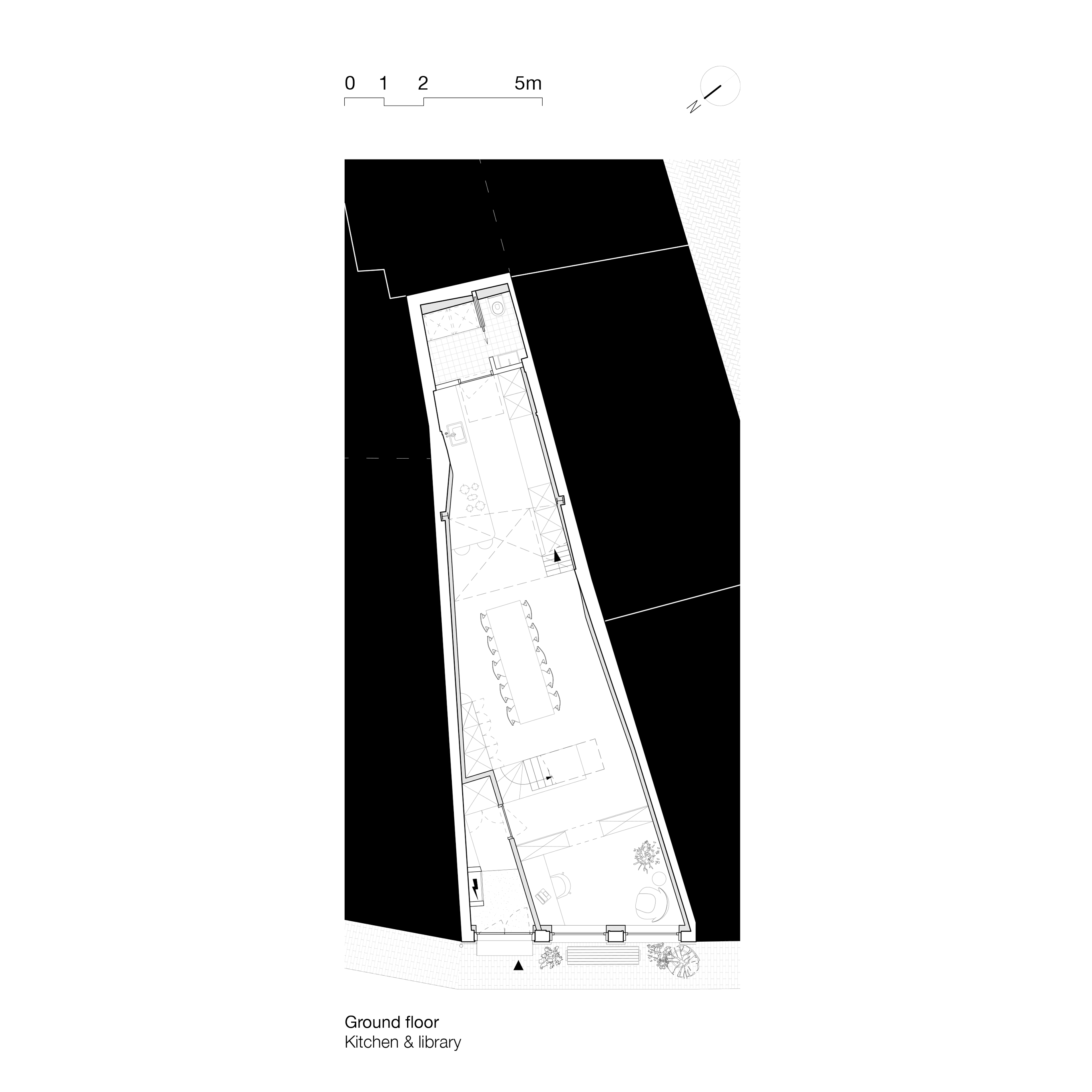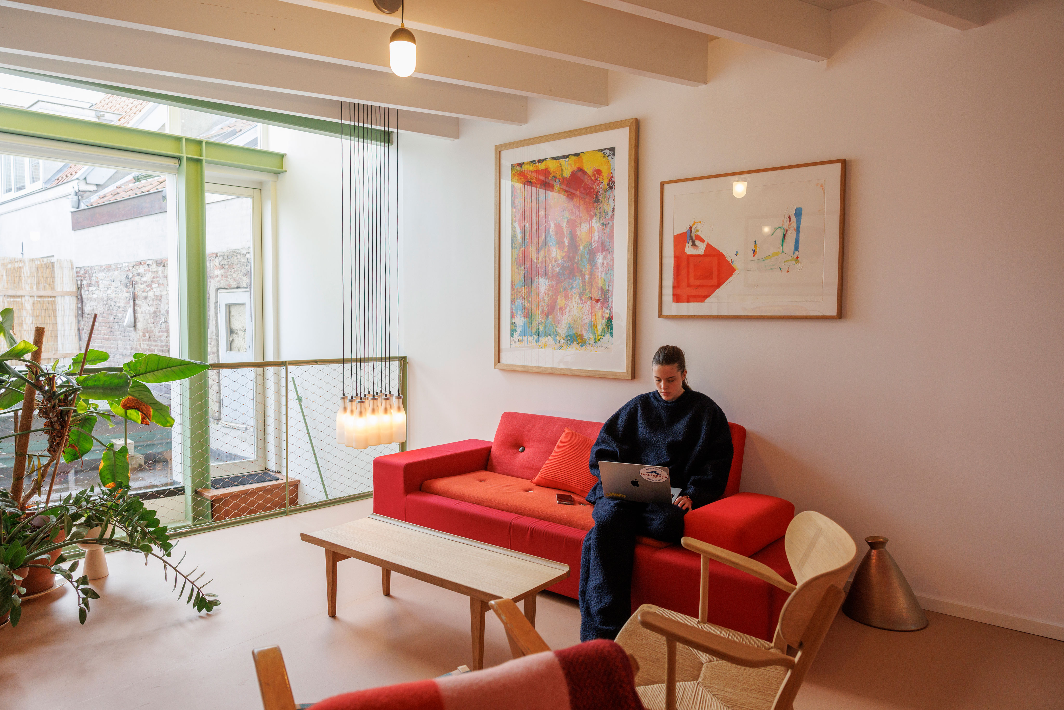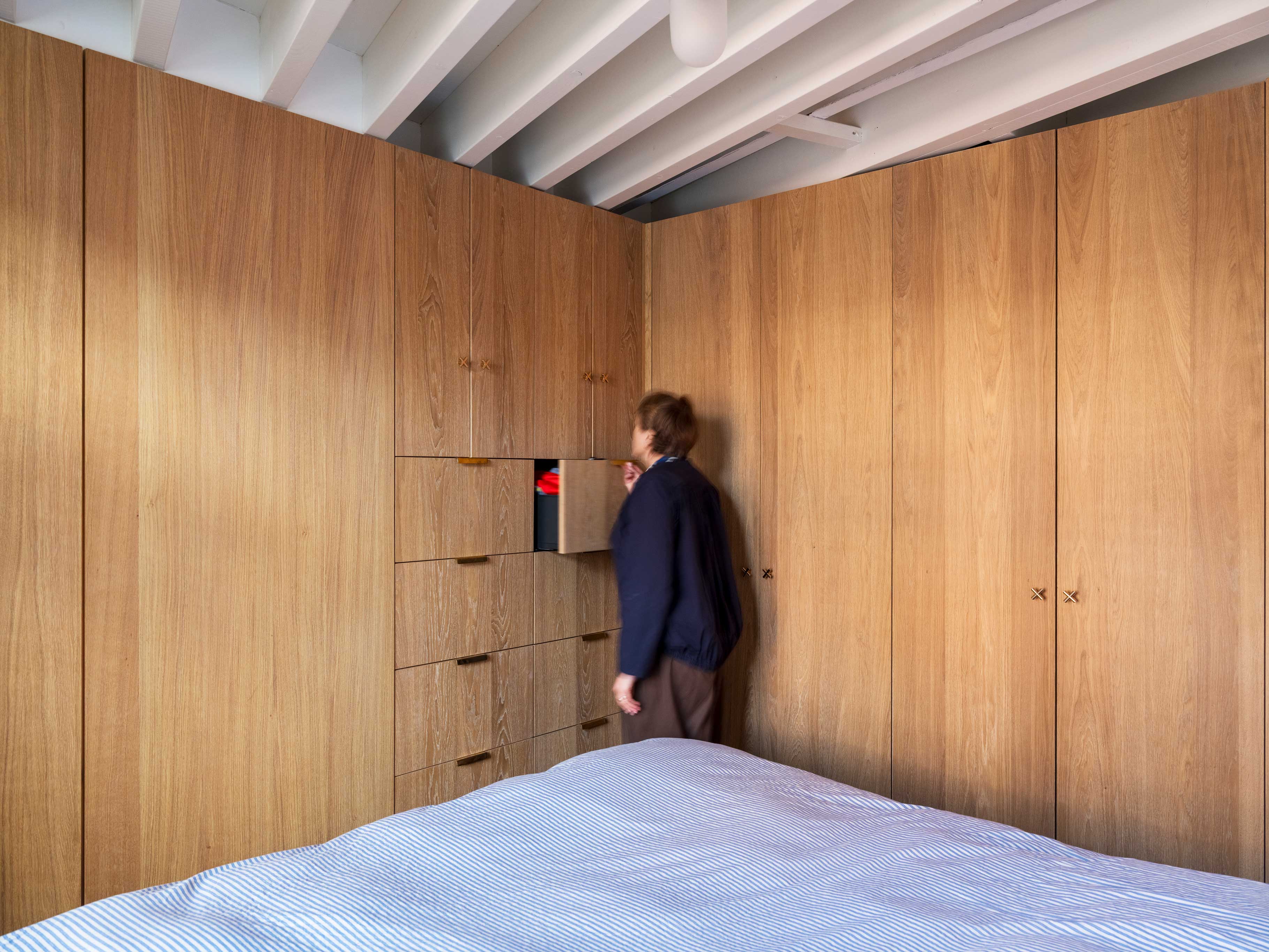 The floor plan is characterized by its wedge-shape where the back part is only two meters wide. Squeezed between the neighboring buildings also meant a lack of daylight and proper connection to the outside court. Opening up the building’s floors and facade where it is the most narrow is the main intervention to bring in the highly needed daylight into the living spaces. This light well also creates new relationships between the various functions: physical and visual. Where previously the house was cramped and claustrophobic, it has now become the surprising and spacious 'internal street' that uses the full eleven meters height of the building.