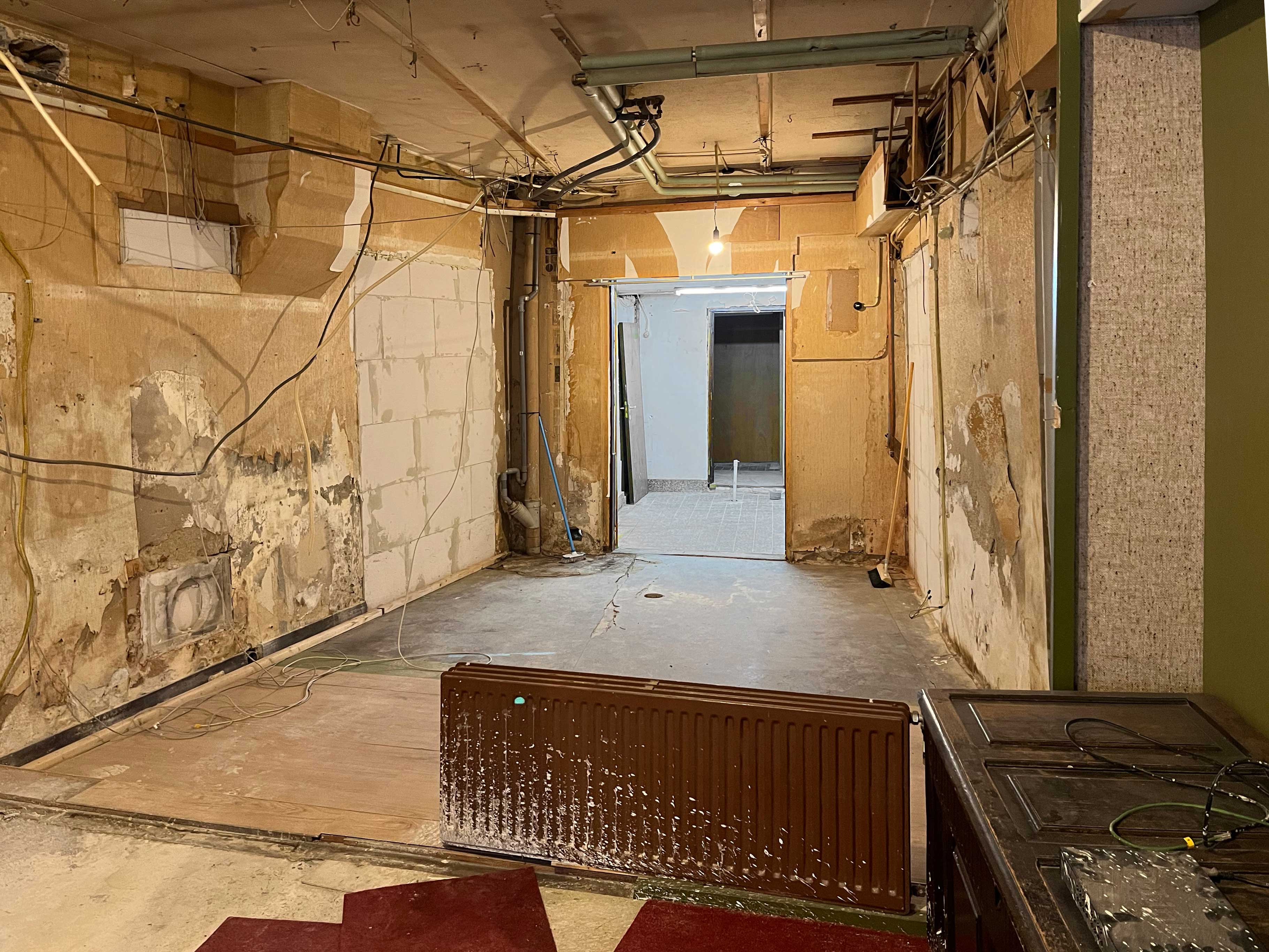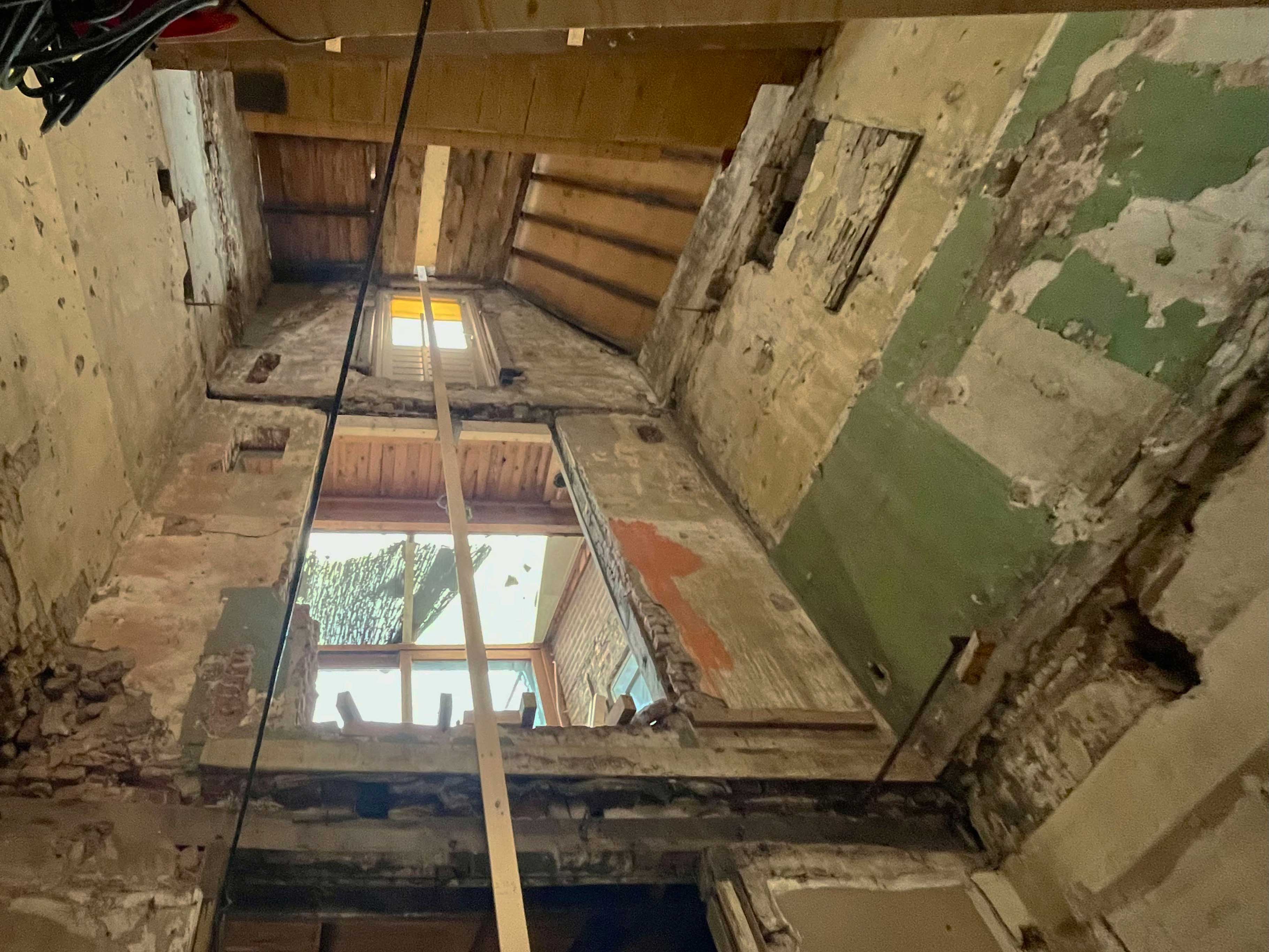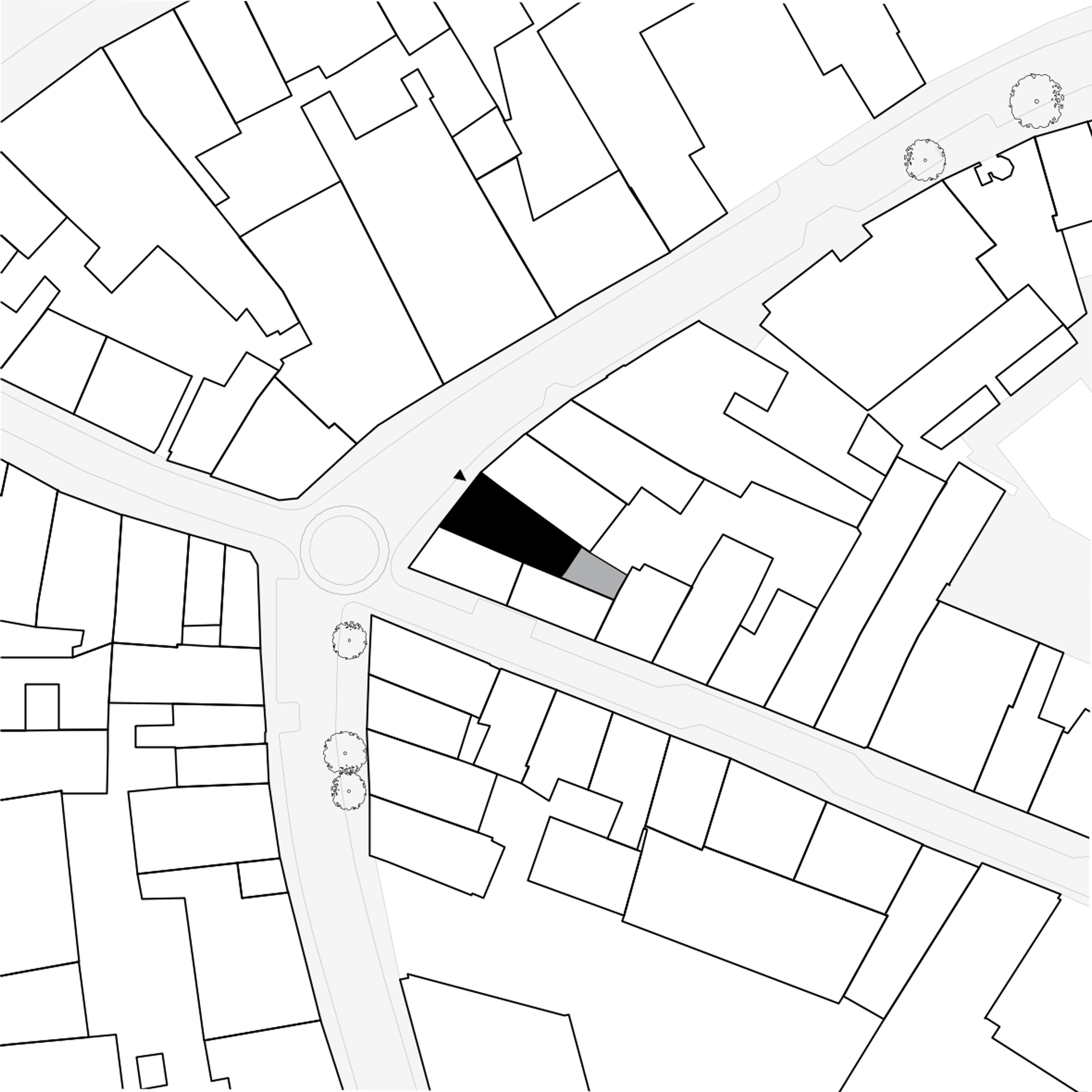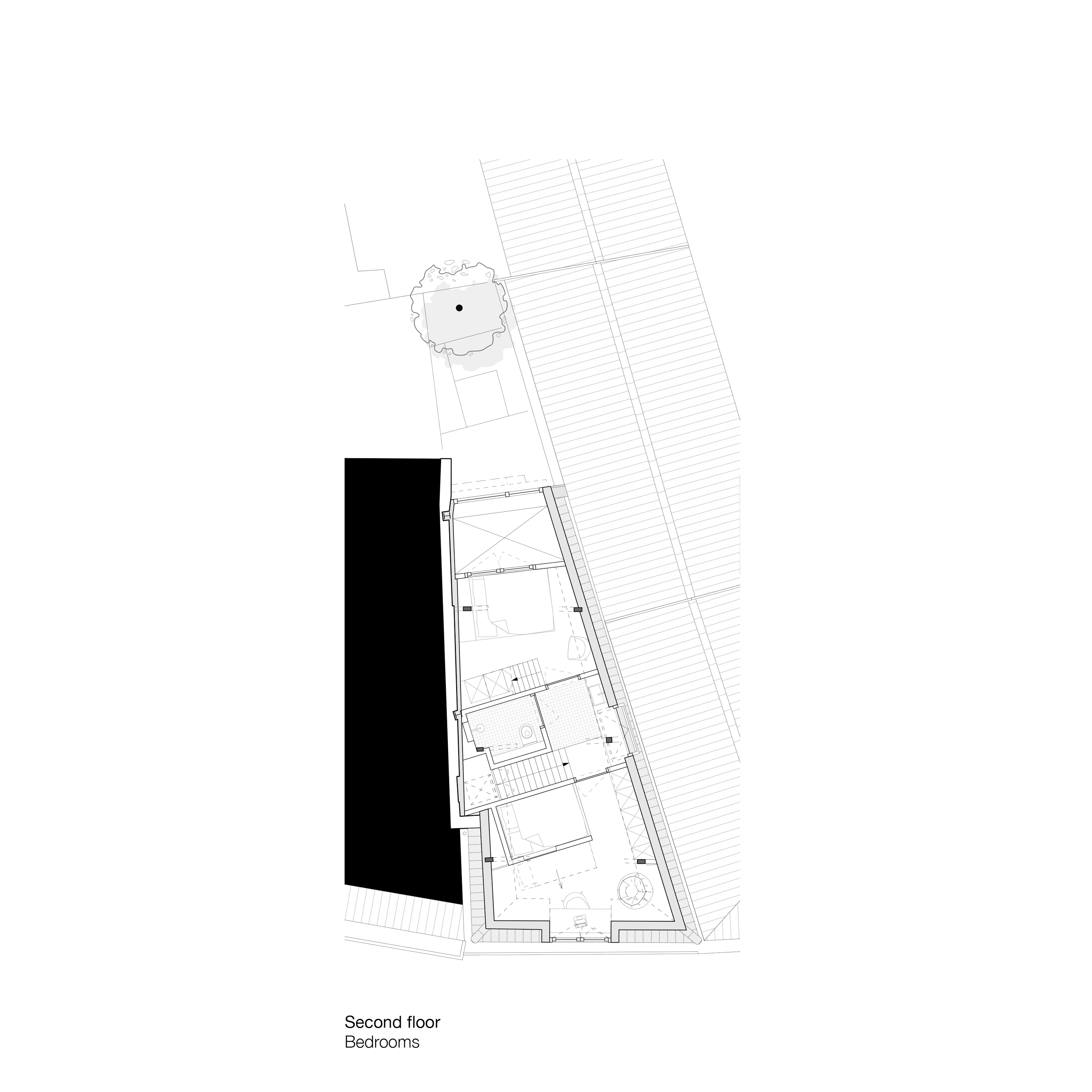 The floor plan is characterized by its wedge-shape where the back part is only two meters wide. Squeezed between the neighboring buildings also meant a lack of daylight and proper connection to the outside court. Opening up the building’s floors and facade where it is the most narrow is the main intervention to bring in the highly needed daylight into the living spaces. This light well also creates new relationships between the various functions: physical and visual. Where previously the house was cramped and claustrophobic, it has now become the surprising and spacious 'internal street' that uses the full eleven meters height of the building.
