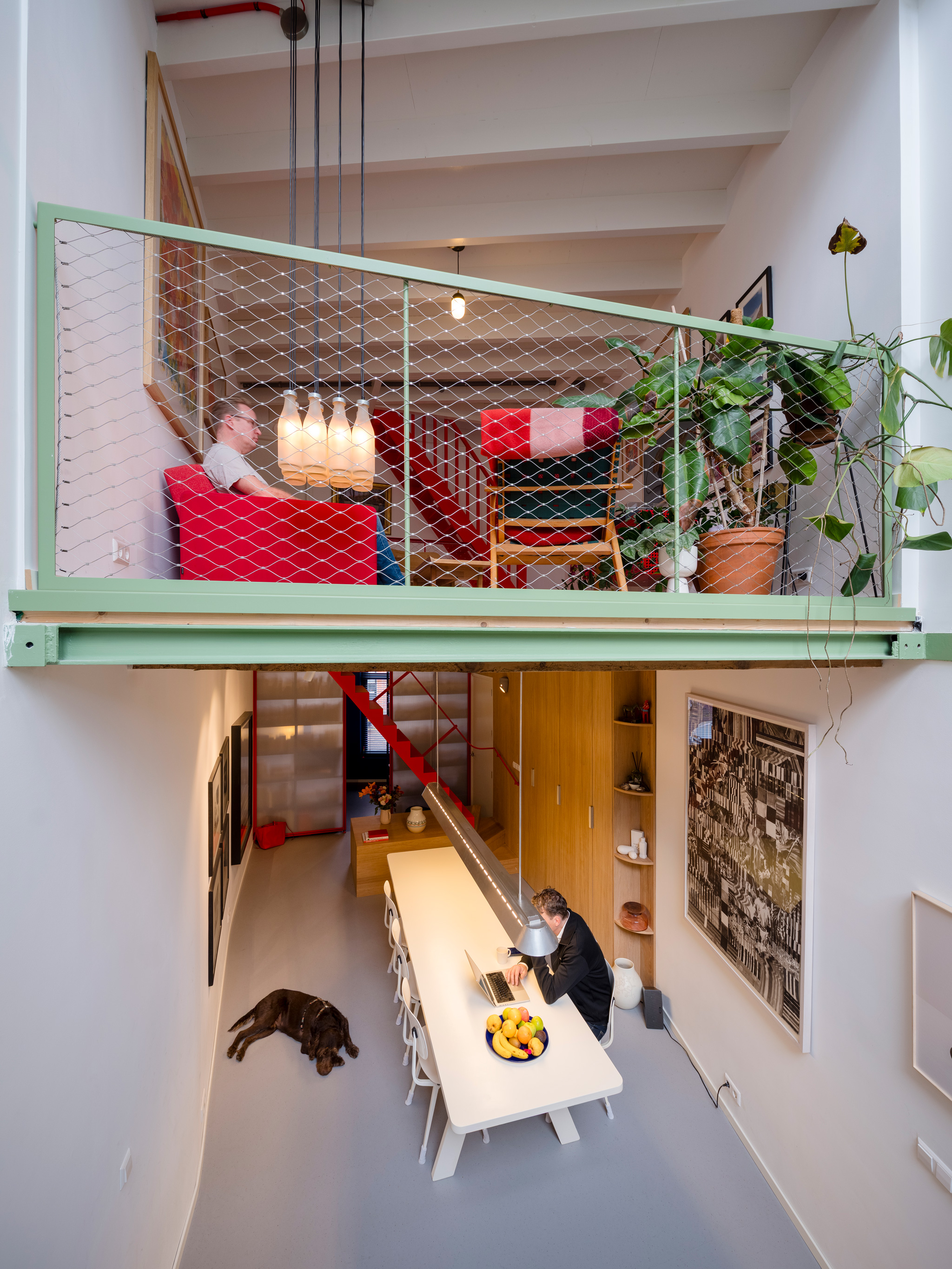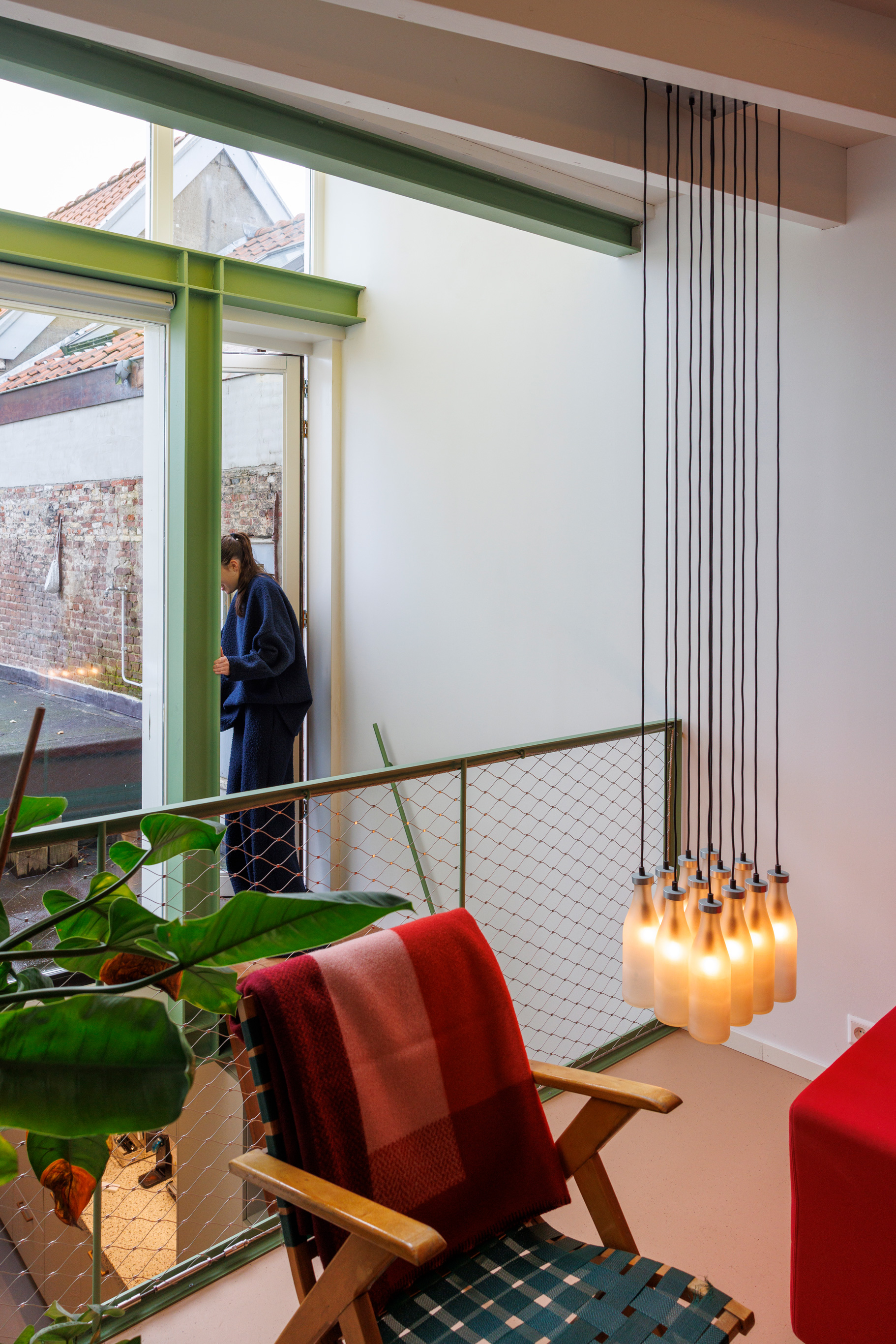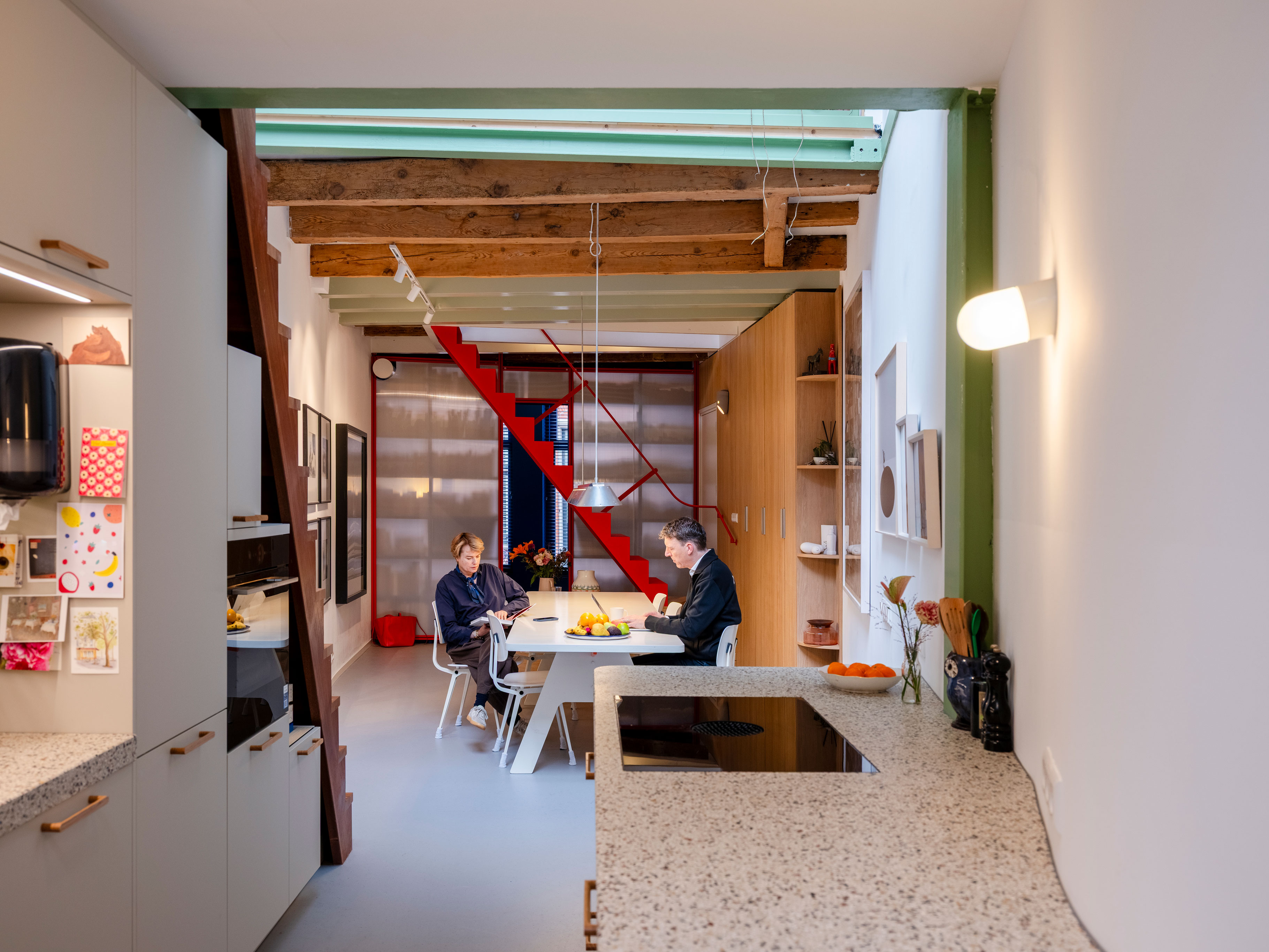 The ground floor is now the active heart of the building, connecting the various functions of the dwelling and the place to come together at the large dining table. It gives access to the small roof terrace above the kitchen and a visual relation with the mezzanine-like living. Where the existing floor beams were the weakest, a new custom-made metal staircase connects the ground floor to the second level, serving as both a sculptural centerpiece as a circulation spine.