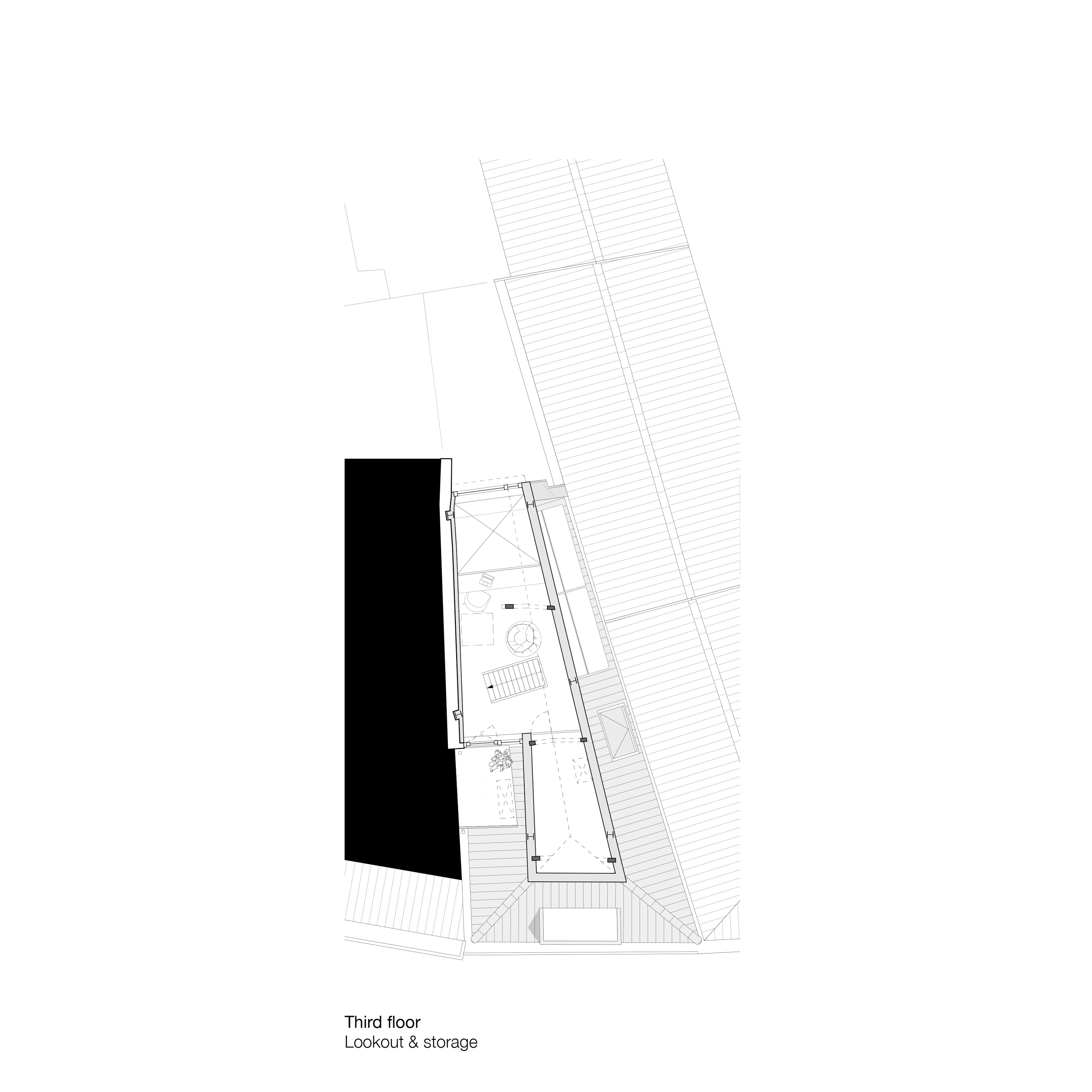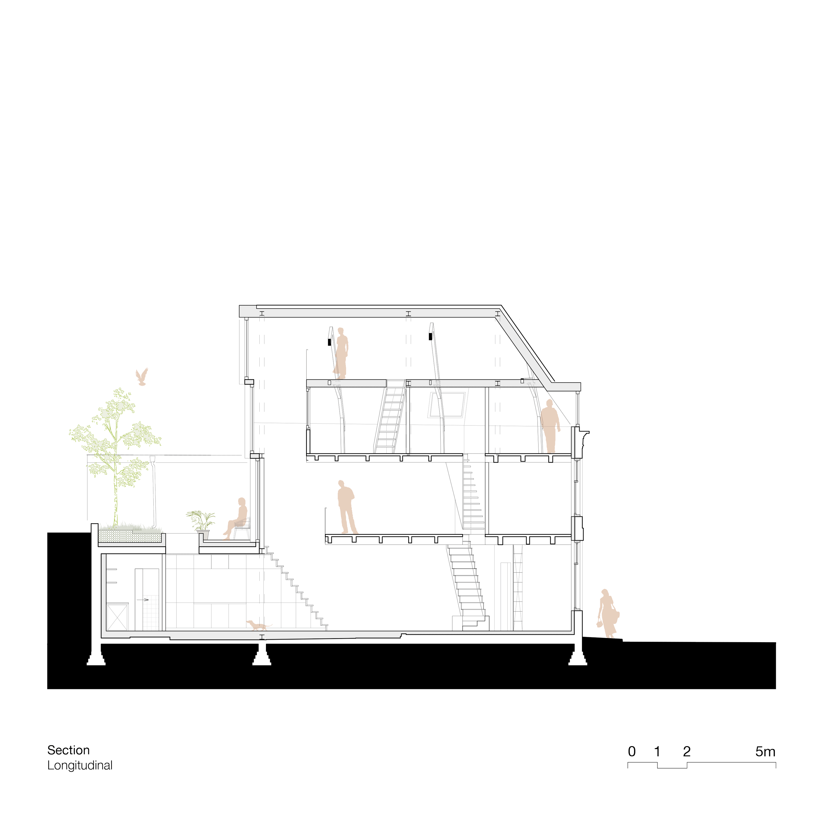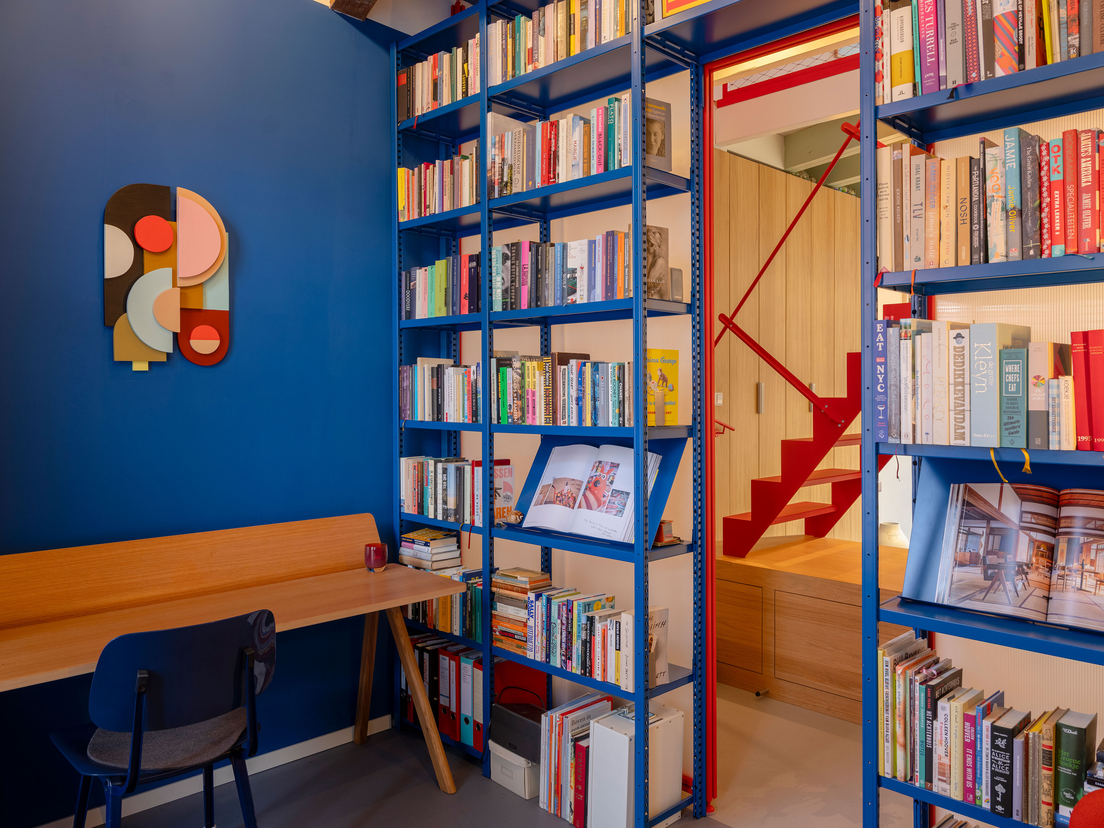 The ground floor is now the active heart of the building, connecting the various functions of the dwelling and the place to come together at the large dining table. It gives access to the small roof terrace above the kitchen and a visual relation with the mezzanine-like living. Where the existing floor beams were the weakest, a new custom-made metal staircase connects the ground floor to the second level, serving as both a sculptural centerpiece as a circulation spine.