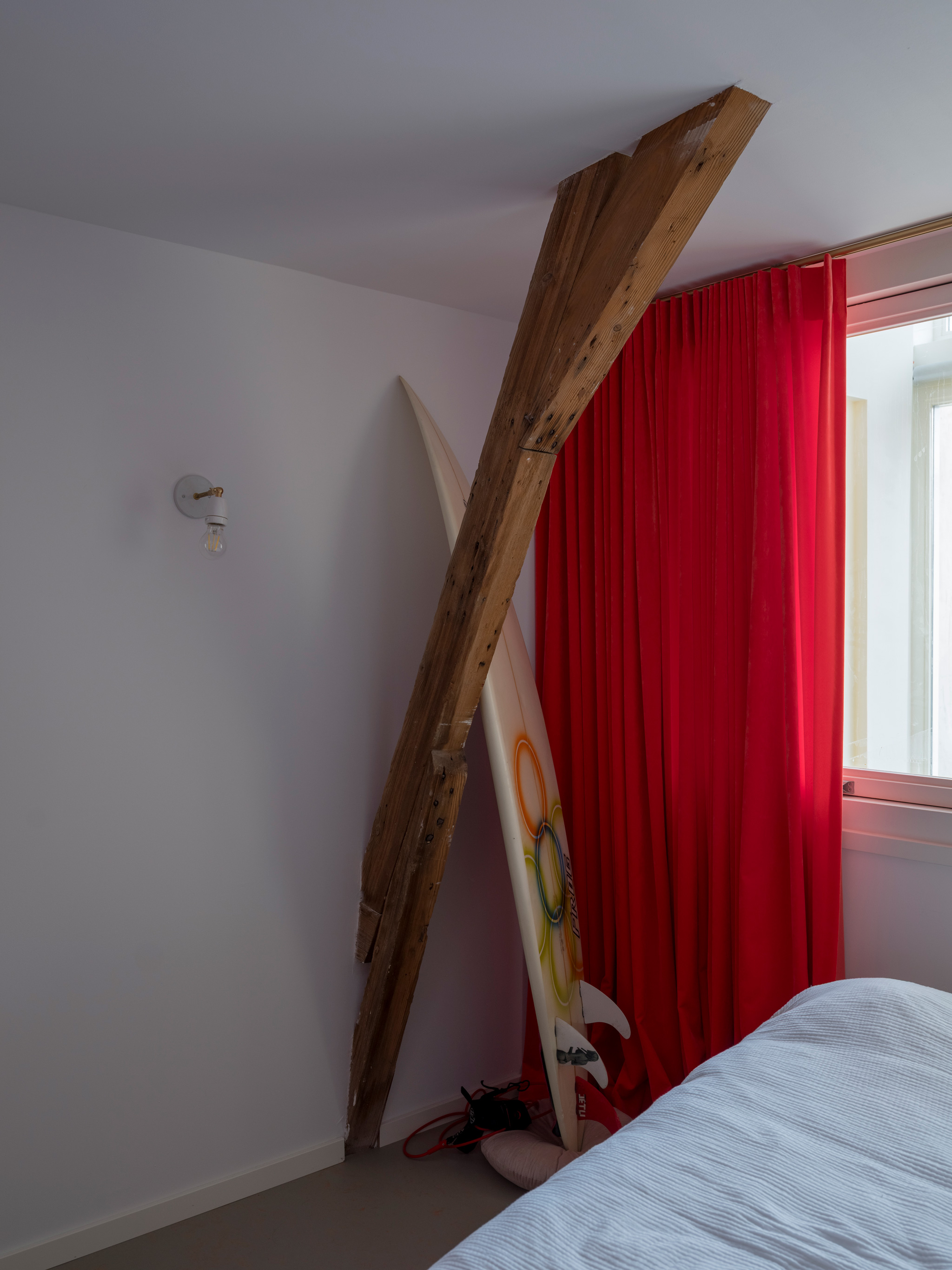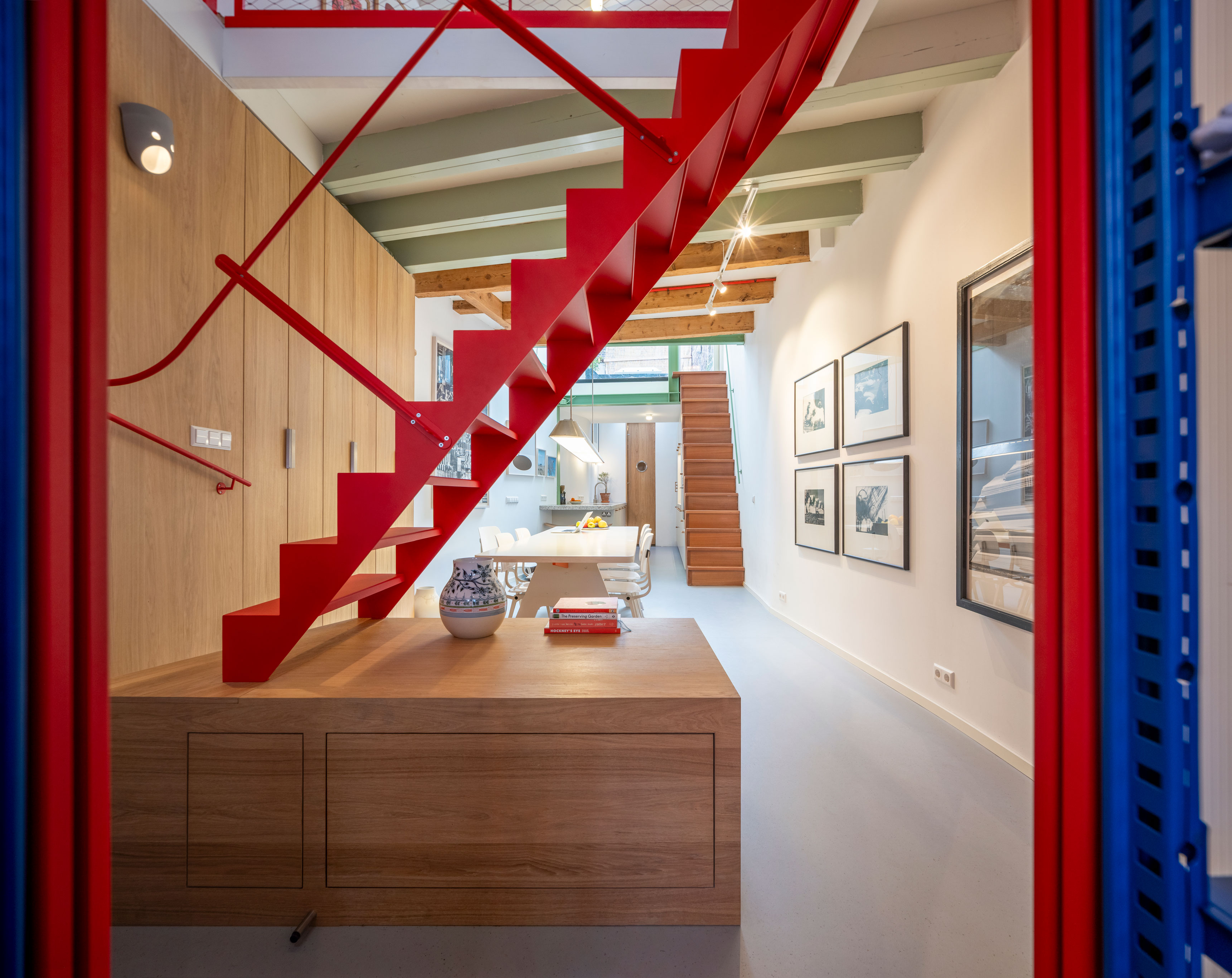Because of the poor condition of the monumental wooden trusses, a new structural and insulated roof was needed, leaving the historical parts visible as museum pieces on the clean outer shell. The top floor houses 'the observatory' which has views over the historical centre of Haarlem. The whole project was done in close collaboration with the clients, who are passionate about contemporary art and design. This created an outspoken dwelling that respects its history and embraces the future in a colorful balance.